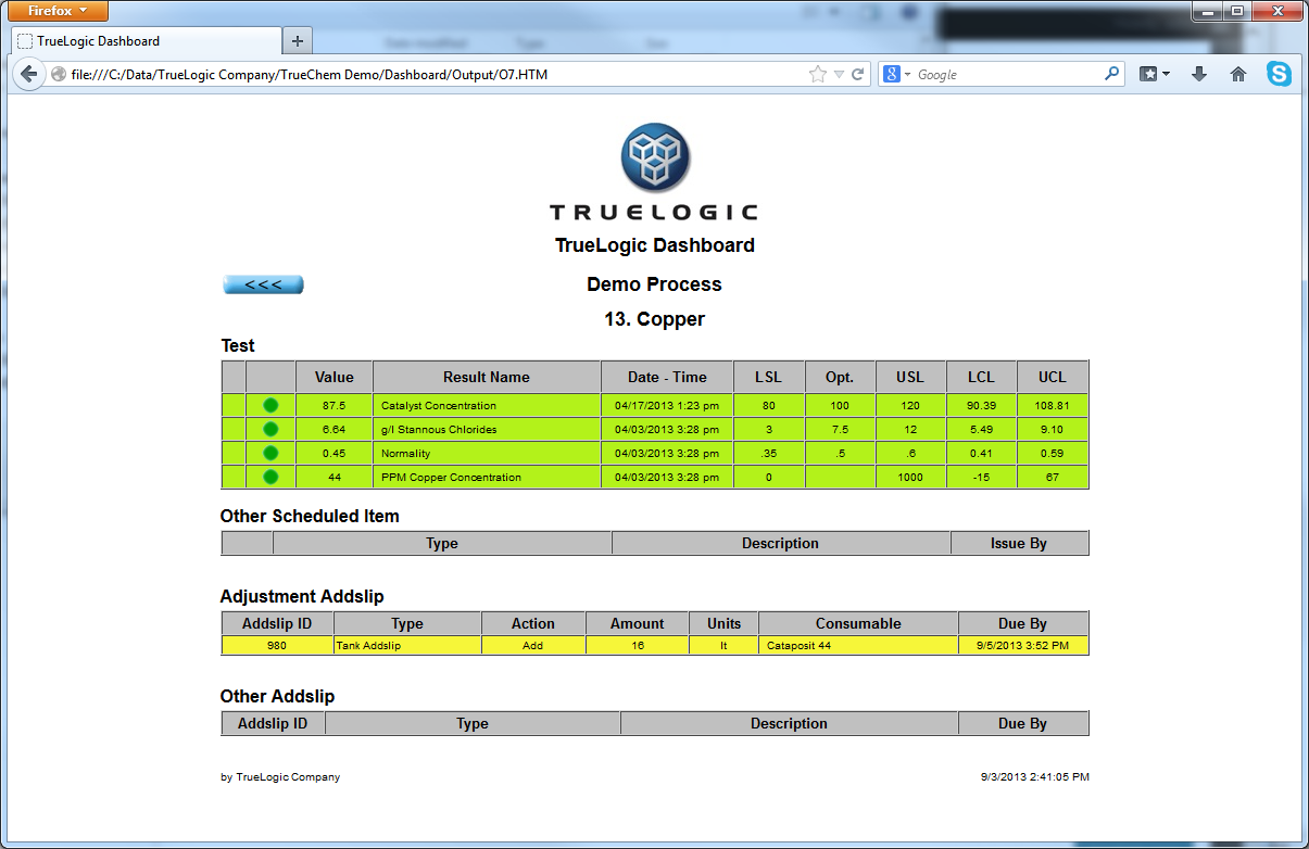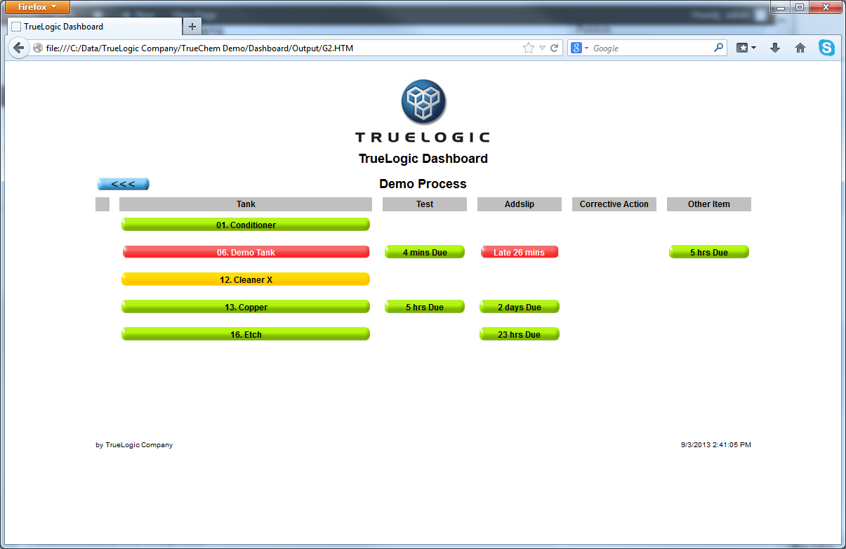 The TrueLogic Dashboard, another optional module, is a high-level view of the data tracked by TrueChem.  The Dashboard, a series of integrated HTML pages viewable using a web-browser, provides a color-coded status of your process components and your  schedule as defined in TrueChem.