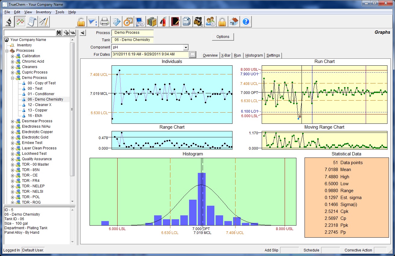 Graphs are a bi-product of data entry, and require no additional action to create. Individual components can be graphed pursuant to the default settings in System Setup, or the user can define a custom view for each component. Authorized users can view the graph data and perform activities such as signing off Corrective Actions and affixing Notes.