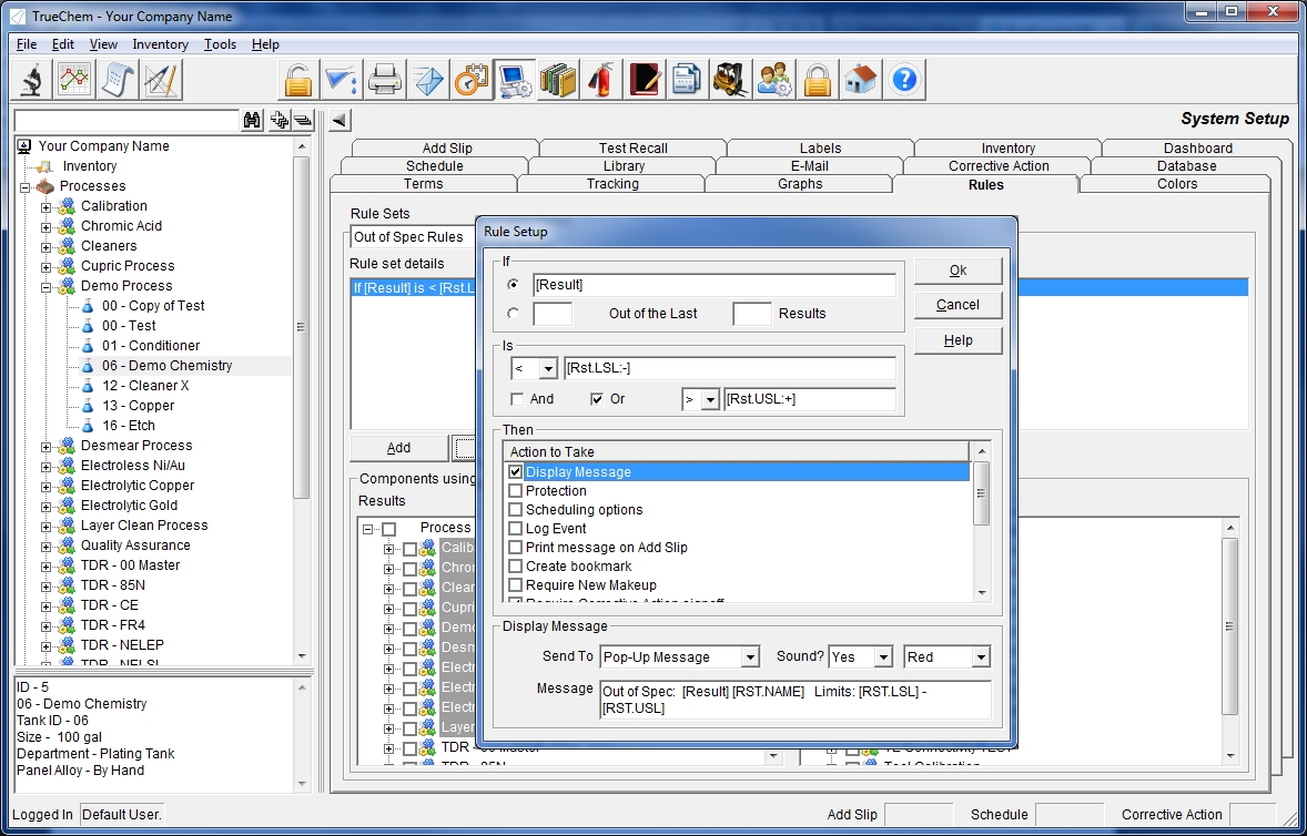 Rules and Rule Sets allow the user to set up “If-Then” statements that look for particular conditions then automatically perform an action or actions if the condition exists. For example, the system can be configured to issue a pop-up message, send an email, etc. based on conditions set by the user.